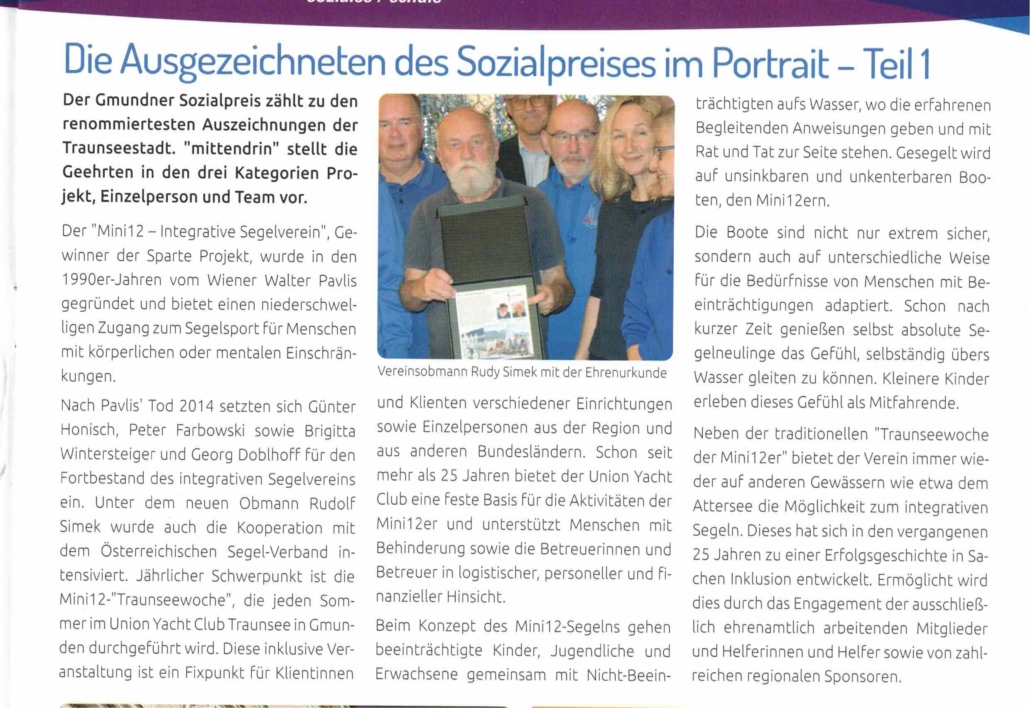 Der integrative Segelverein „Mini12“ erhielt den Sozialpreis 2025 der Stadt Gmunden für sein Projekt „Mini12-Traunseewoche“. Diese inklusiven Segeltage werden jährlich Ende Juni/Anfang Juli durchgeführt.